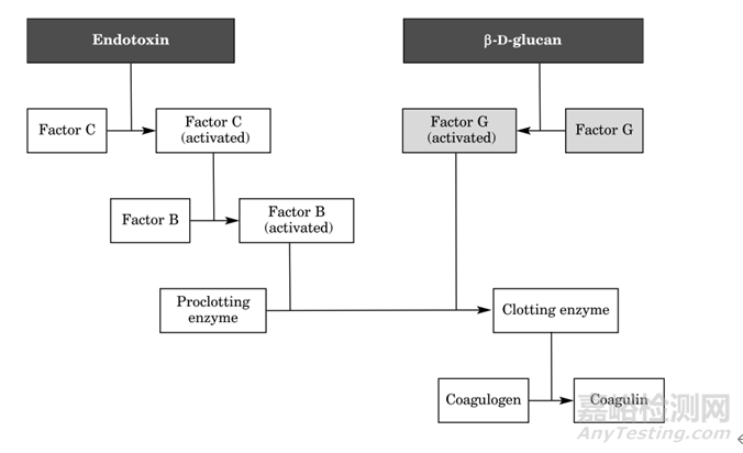 圖2 內(nèi)毒素介導(dǎo)的具有交替葡聚糖激活途徑的LAL凝血級(jí)聯(lián)激活[1]