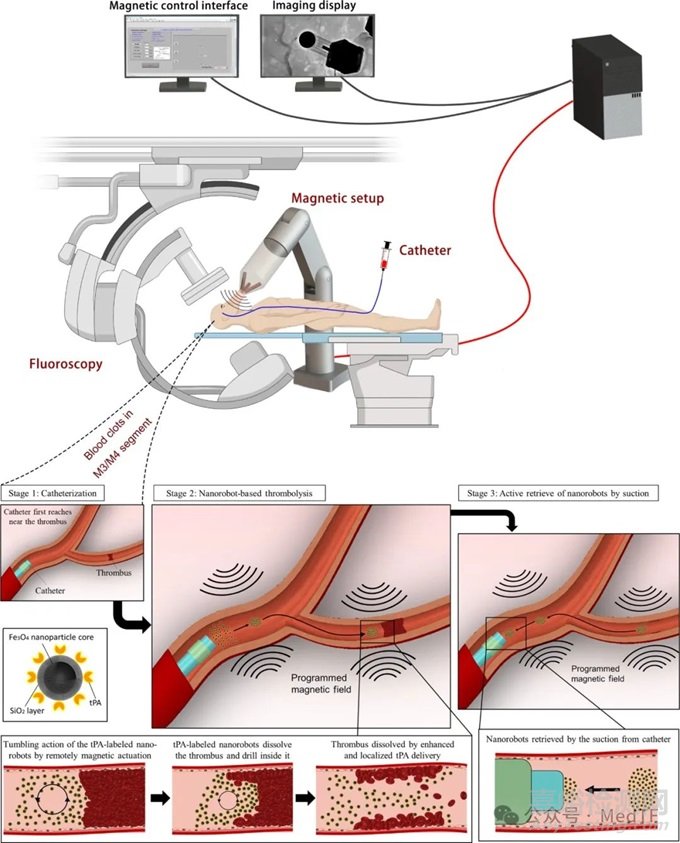 使用導(dǎo)管輔助磁控輸送tPA-nbots,進(jìn)行定向溶栓和原位召回的概念圖