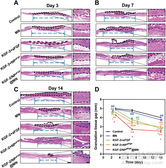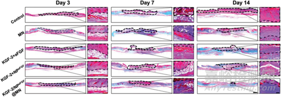在創(chuàng)面修復(fù)過程中,角質(zhì)形成細(xì)胞從創(chuàng)面邊緣遷移至創(chuàng)面中心,并逐漸閉合創(chuàng)面,這一過程稱為再上皮化。實(shí)際上,再上皮化對燒傷創(chuàng)面愈合至關(guān)重要,燒傷創(chuàng)面表皮的嚴(yán)重受損會影響角質(zhì)形成細(xì)胞的遷移。因此,在本研究中,我們對角蛋白進(jìn)行了免疫組織化學(xué)染色,以評估傷口愈合過程中的再上皮化。各組創(chuàng)面組織均出現(xiàn)不同程度的再上皮化。在整個愈合過程中,對照組再上皮化最慢,表皮遷移速度較慢,而KGF-2/NPaFGF@MN組表皮遷移速度最快,與H&E和MT染色結(jié)果一致。此外,圖6中黑色虛線所示的焦痂也表明,應(yīng)用KGF-2/NPaFGF@MN可以減少焦痂形成。由此可見,KGF-2/NPaFGF@MN組通過加速角質(zhì)形成細(xì)胞遷移、成纖維細(xì)胞增殖、肉芽組織形成和膠原沉積,促進(jìn)創(chuàng)面更快愈合。