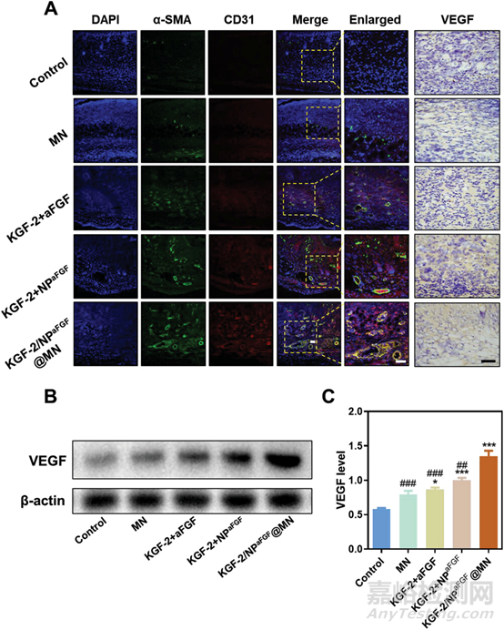 在本研究中,開發(fā)了一種新型的微針貼片,以實(shí)現(xiàn)燒傷創(chuàng)面治療中KGF-2和aFGF的不同釋放模式。首先將aFGF包裹在PLGA納米粒中,實(shí)現(xiàn)aFGF相對緩慢的釋放。然后將NPaFGF與KGF-2結(jié)合形成MN補(bǔ)片(KGF-2/NPaFGF@MN)。以核黃素作為光引發(fā)劑制備MN。本文是第一個報(bào)道基于生長因子釋放核黃素的微核貼片的文獻(xiàn)。KGF-2/NPaFGF@MN在體內(nèi)表現(xiàn)出較高的愈合效率,減少了焦痂形成,增加了肉芽形成、膠原沉積和新生血管形成。這是因?yàn)镵GF-2/NPaFGF@MN通過釋放KGF-2促進(jìn)再上皮化和aFGF促進(jìn)真皮形成以閉合創(chuàng)面間隙,共同加速創(chuàng)面修復(fù)過程。此外,免疫染色和蛋白印跡法研究表明,這種新型補(bǔ)片可以顯著上調(diào)Hsp90和HIF-1α,進(jìn)而誘導(dǎo)血管生成和促進(jìn)傷口愈合。以上結(jié)果表明,聯(lián)合或序貫釋放不同的GFs是治療燒傷創(chuàng)面的一種有前景的策略。