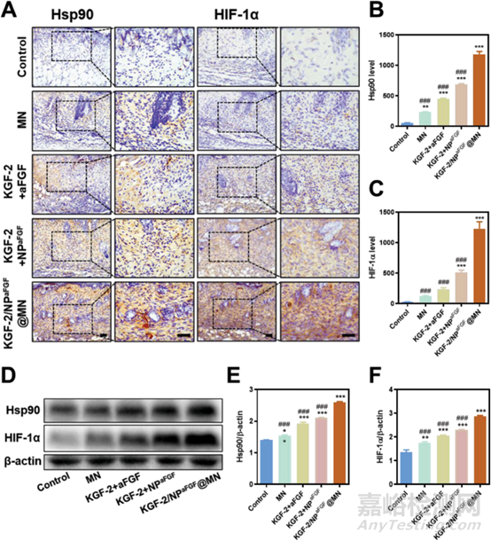 HIF-1α和Hsp90都是通過調(diào)節(jié)血管生成和血管重塑協(xié)同加速創(chuàng)面愈合的關(guān)鍵因子。燒傷后血管完整性受損,導(dǎo)致HIF-1α和Hsp90表達(dá)下調(diào)。本研究采用免疫組織化學(xué)染色和蛋白印跡法檢測HIF-1α和Hsp90在創(chuàng)面中的表達(dá),以進(jìn)一步闡明創(chuàng)面愈合的機(jī)制。如圖8A所示,與Hsp90和HIF-1α表達(dá)最低的對照組相比,MN和含aFGF的游離KGF-2都調(diào)節(jié)了Hsp90和HIF-1α的水平,表明MN和生長因子可以正向啟動Hsp90和HIF-1α的表達(dá)。而KGF-2+NPaFGF組的Hsp90和HIF-1α染色陽性率高于KGF-2+aFGF組,表明納米粒的aFGF釋放模式可以提高aFGF在創(chuàng)面中的生物效應(yīng)。最重要的是,KGF-2/NPaFGF@MN處理組顯示出極高的Hsp90和HIF-1α水平,證實(shí)了MN作為藥物遞送系統(tǒng)以及KGF-2和NPaFGF雙重驅(qū)動因子在燒傷創(chuàng)面修復(fù)中的積極作用。綜上所述,這些結(jié)果證實(shí)了燒傷創(chuàng)面中Hsp90和HIF-α的上調(diào)可顯著提高創(chuàng)面修復(fù)率。它們可能成為未來促進(jìn)燒傷創(chuàng)面再生的靶調(diào)控因子。