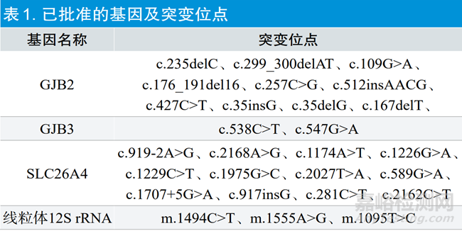 截至2023年6月,已批準(zhǔn)的遺傳性耳聾相關(guān)基因檢測試劑共11個,檢測的基因位點已覆蓋四個基因的20余個突變位點(表1),樣本類型包括靜脈全血和干血斑。目前所批準(zhǔn)的檢測試劑的預(yù)期用途均為“用于遺傳性耳聾的輔助診斷”。