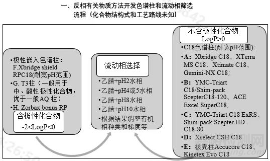 研發(fā)初期因質(zhì)量研究人員所能獲知的化合物信息有限,雜質(zhì)結(jié)構(gòu)信息(一般工藝路線處于保密狀態(tài))未知;而在研發(fā)中后期才有可能獲取該信息,故本文將有關(guān)物質(zhì)方法開(kāi)發(fā)流程分為這兩部分分別進(jìn)行闡述。