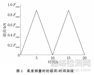 首先,在缺口試樣上測量試樣柔度V/F,用疲勞裂紋擴(kuò)展速率試驗最大載荷的0.9倍(0.9Fmax)對試樣進(jìn)行彎曲加載-卸載,為了保證加載的穩(wěn)定性,加載-卸載周期為10s,連續(xù)加載10次,記錄載荷F和對應(yīng)裂紋嘴張開位移V的值。柔度測量時的載荷-時間曲線如圖1所示。