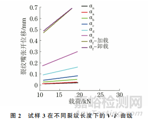 柔度測量時采用末5次循環(huán)的載荷F和裂紋嘴張開位移V,在最大載荷的50%~90%對V-F曲線求斜率,以獲得試樣的柔度,根據(jù)柔度函數(shù)關(guān)系式測算裂紋的長度,測算使用的彈性模量為鋼鐵材料典型值206GPa。以試樣3(厚度為20mm)為例,不同裂紋長度下的V-F曲線如圖2所示。由圖2可知:隨著裂紋長度的增大,試樣柔度V/F增大,當(dāng)裂紋長度達(dá)到約0.7W時,加載柔度和卸載柔度有明顯區(qū)別,此時試樣裂紋尖端已經(jīng)有較明顯的塑性變形,試樣不再是近似理想的彈性體,會對柔度函數(shù)關(guān)系造成一定影響。