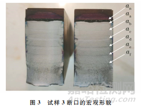 最后,試樣在裂紋擴(kuò)展的最后階段發(fā)生彎曲失效,將試樣沿裂紋面打開,用顯微鏡測量標(biāo)記的裂紋長度。
