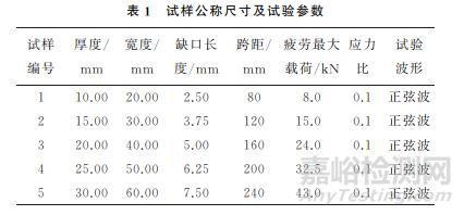 將10Ni6CrCuMoV 鋼板(板厚為30mm)按照GB/T 6398—2017《金屬材料疲勞試驗疲勞裂紋擴(kuò)展方法》的要求加工成不同厚度的三點彎曲試樣,取樣位置為板厚中心處,試樣長度方向垂直于軋制方向。利用電液伺服疲勞試驗機(jī)對試樣進(jìn)行疲勞裂紋擴(kuò)展速率試驗,每組3個平行試樣,試樣公稱尺寸及試驗參數(shù)如表1所示。