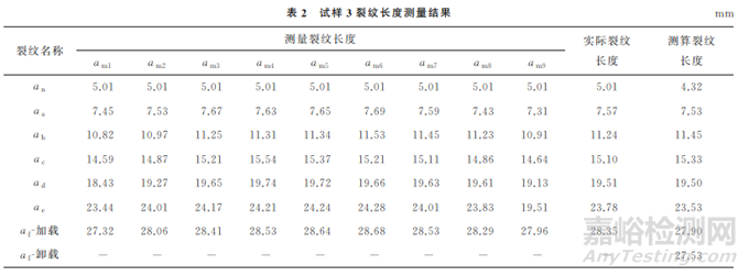 采用九點法在顯微鏡下觀察試樣斷口,測量并計算對應(yīng)的實際裂紋長度,試樣3斷口的宏觀形貌如圖3所示。測量裂紋長度、實際裂紋長度a'和柔度法測算裂紋長度a(1)結(jié)果如表2所示。其他試樣斷口的宏觀形貌、裂紋長度測量及測算方法與試樣3相同,其中試樣1(厚度為10mm)的尺寸較小,在裂紋長度達(dá)到0.7W之前就發(fā)生了失效。