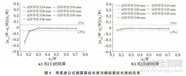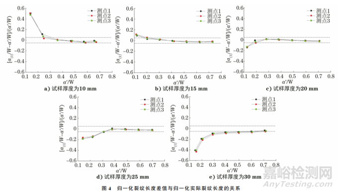 (1)對于不同厚度的 10Ni6CrCuMoV鋼 三 點彎曲試樣,當(dāng)試樣厚度不大于25mm,歸一化實際裂紋長度a'/W ≥0.3時,柔度法測算裂紋長度a(1)與真實裂紋長度a'相差小于 5%,認(rèn)為a(1)有較好的準(zhǔn)確性。