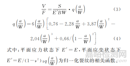 ASTM E399-22 Standard Test Method for Linear-Elastic Plane-Strain Fracture Toughness of Metallic Materials附錄中指出,三點彎曲試樣裂紋嘴張開位移柔度與裂紋長度的關(guān)系如式(3),(4)所示。