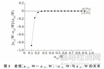 以式(3)中的a(3)/W為自變量,經(jīng)過計算,a(1)/W與a(3)/W的差值[a(1)/W -a(3)/W]/(a(3)/W)與a(3)/W 的關(guān)系如圖5 所示。由圖5可知:當(dāng)a(3)/W≤0.2時,a(1)/W比a(3)/W 明顯偏小,當(dāng)a(3)/W=0.15時,差值約為17%,隨著a(3)/W的增加,差值快速減?。划?dāng)a(3)/W≥0.3時,差值小于0.5%。因此,根據(jù)柔度函數(shù)關(guān)系式的適用條件,使用式(1)進(jìn)行裂紋長度測算時,要求實際裂紋長度a'/W≥0.3是保證測算結(jié)果準(zhǔn)確的必要條件。