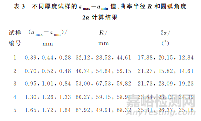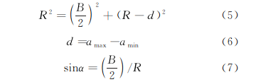 在金屬材料的疲勞裂紋擴(kuò)展速率試驗中,裂紋中心處的材料處于平面應(yīng)變狀態(tài),承受的應(yīng)力比試樣兩側(cè)的應(yīng)力大,因此中心處的裂紋擴(kuò)展速率較快,兩側(cè)的裂紋擴(kuò)展速率較慢,裂紋前緣類似圓弧狀。用圓弧近似裂紋前緣的形狀,根據(jù)最大裂紋長度amax、最小裂紋長度amin與試樣厚度B之間的幾何關(guān)系,裂紋前緣的彎曲半徑R,圓弧角度2α的計算關(guān)系分別如式(5)~(7)所示。