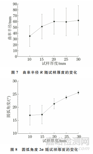 根據(jù)式(5)~(7)和試驗結(jié)果,計算當(dāng)a/W約為0.4時,不同厚度試樣的amax-amin值、曲率半徑R和圓弧角度2α,結(jié)果如表3所示。曲率半徑R隨試樣厚度的變化如圖7所示,圓弧角度2α 隨試樣厚度的變化如圖8所示。由圖7,8可知:隨著試樣厚度的增大,裂紋的曲率半徑R增大,但增大趨勢并不明顯;隨著試樣厚度的增大,圓弧角度2α增大,且具有明顯的增長趨勢。圓弧角度2α不但與曲率半徑R有關(guān),還有試樣厚度有關(guān),因此對于不同厚度的試樣,圓弧角度2α比曲率半徑R更能近似地描述裂紋前緣的彎曲程度。