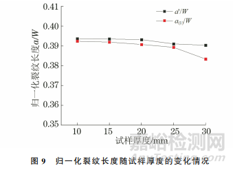 用有限元方法模擬amax/W=0.4時,不同厚度試樣的受力狀態(tài),圓弧角度2α 采用圖8中的平均值。不同厚度試樣對應(yīng)的歸一化實際裂紋長度a'/W和歸一化柔度法測算裂紋長度a(1)/W 對比結(jié)果如圖9所示。由圖9可知:a(1)/W比a'/W小,當(dāng)試樣厚度由25mm增大至30mm時,a(1)/W比a'/W 差值明顯增大,由約0.5%增大至約2.0%。說明隨著試樣厚度的增加,圓弧角度2α增大,影響了裂紋的平直度,柔度法測算的裂紋長度a(1)比實際裂紋長度a'偏小。對于疲勞裂紋擴(kuò)展速率試驗,不同材料的裂紋前緣彎曲程度不同,如果材料裂紋前緣的圓弧角度過大,則不宜采用較厚 (厚度不小于30mm)試樣進(jìn)行試驗。