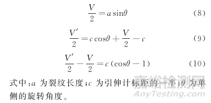 裂紋嘴張開位移V是指試樣邊緣處裂紋面的張開量,實際試驗時由于引伸計標(biāo)距的原因,引伸計測得的裂紋嘴張開位移V'是實際位移V的近似值。三點彎曲加載時,假設(shè)試樣兩側(cè)以裂紋頂端為圓心對稱旋轉(zhuǎn),以試樣左半部為例,裂紋嘴張開位移V的計算方法如式(8)~(10)所示。