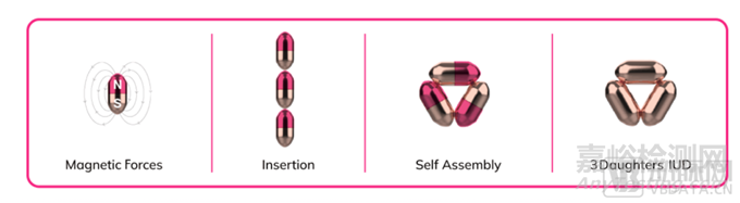 與目前采用硬質(zhì)塑料T形框架的宮內(nèi)節(jié)育器不同,3Daughters擁有全新設(shè)計(jì)、獲得專利的無(wú)框磁性自組裝宮內(nèi)節(jié)育器(產(chǎn)品編號(hào)3D-001),設(shè)計(jì)符合女性的身體曲線,不需要任何牽引繩。3Daughters IUD采用創(chuàng)新設(shè)計(jì),由三個(gè)小型的橢圓形磁性單元組成。