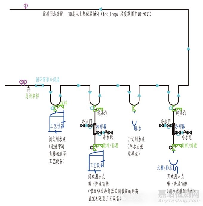 注射用水系統(tǒng)采用常見(jiàn)蒸餾制水法,通過(guò)符合純化水水質(zhì)標(biāo)準(zhǔn)的水作為原料水,經(jīng)過(guò)蒸餾法制得注射用水,雖然在 70 ℃以上熱儲(chǔ)分系統(tǒng)的水溫越高,微生物越難滋生,但是考慮到 80 ℃以上熱水循環(huán)系統(tǒng)由于長(zhǎng)時(shí)間持續(xù)高溫易產(chǎn)生紅銹風(fēng)險(xiǎn),同時(shí)為了降低能耗,節(jié)約工業(yè)蒸汽及冷卻水等用量,注射用水保溫?zé)嵫h(huán)的儲(chǔ)分系統(tǒng)溫度控制范圍宜在 70 ~ 80 ℃,可有效降低能耗及紅銹污染風(fēng)險(xiǎn)。注射用水制備儲(chǔ)分系統(tǒng)要做到全系統(tǒng)均能最低點(diǎn)排凈,且注意回水流速控制,做到全循環(huán)管道均能完全湍流,降低罐壁、管壁等吸附滯留微生物風(fēng)險(xiǎn),循環(huán)系統(tǒng)配備過(guò)熱水滅菌用換熱器和紫外燈(UV),全時(shí)段紫外消毒,再輔以周期性過(guò)熱水滅菌,有效控制微生物和細(xì)菌內(nèi)毒素污染風(fēng)險(xiǎn)。熱注射用水通常水溫過(guò)高,如果用于手工清洗工器具,需要降溫使用,為了盡量防止大循環(huán)系統(tǒng)受到不利干擾風(fēng)險(xiǎn),通常設(shè)計(jì) WFI 用水點(diǎn)下降溫裝置,這樣個(gè)別用水點(diǎn)降溫使用時(shí),不影響整個(gè)大循環(huán)系統(tǒng)的溫度控制。