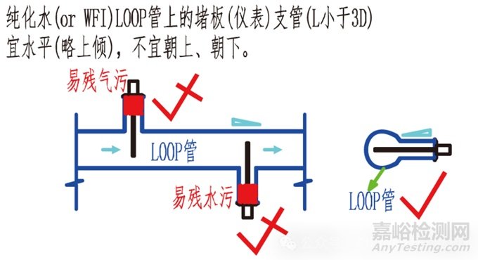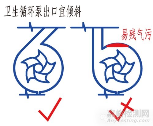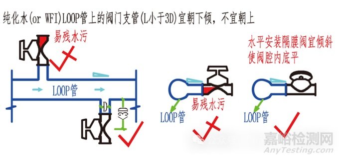 當(dāng)然 WFI(PW)循環(huán)管路上的支口做法也有講究,不僅要符合“3D”規(guī)則,而且要分析水在泵送壓力和滋生重力雙重影響下的流動(dòng)規(guī)律,如果支口方向設(shè)計(jì)不當(dāng),同樣會(huì)增大微生物等污染風(fēng)險(xiǎn)。例如,循環(huán)管路支口上帶隔膜閥的,常作為用水點(diǎn),此時(shí)閥門(mén)就不宜朝上開(kāi)口安裝,否則閥門(mén)關(guān)閉后上口殘留有一段死水不便排凈,此段死水易滋生微生物,在閥門(mén)再次打開(kāi)后易與循環(huán)管路內(nèi)的水發(fā)生混合,不僅導(dǎo)致用水點(diǎn)水質(zhì)受到不利影響,而且易污染到整個(gè)循環(huán)系統(tǒng)。另外,對(duì)于循環(huán)系統(tǒng)上的有些儀表是采用堵板支口形式安裝的,這種堵板支口設(shè)計(jì)朝向不宜朝上,否則上側(cè)“盲腸”端頭處會(huì)導(dǎo)致氣體集聚,形成死氣段污染),也不宜垂直朝下,否則下側(cè)端頭易產(chǎn)生沉淀聚集,易形成死水段,增加微生物等污染風(fēng)險(xiǎn)。