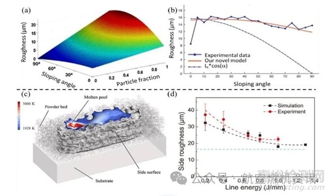 迄今為止,關(guān)于金屬AM過程表面質(zhì)量建模的研究工作有限。Strano等提出了一個(gè)考慮部分粘合顆粒對表面粗糙度影響的分析模型。預(yù)測結(jié)果表明,高傾斜表面的粗糙度顯著在折痕處隨顆粒分?jǐn)?shù)發(fā)生變化,如下圖a所示。通過實(shí)驗(yàn)測量不同傾斜角度表面的粗糙度來驗(yàn)證新模型,如下圖b所示。Boschetto等建立的理論粗糙度模型考慮了階梯效應(yīng)和球化效應(yīng)對粗糙度的影響,并以AlSi10Mg SLM為例進(jìn)行了驗(yàn)證。除了解析建模外,Yan等利用有限體積法(FVM)建立了PBF過程的高保真粉末尺度模型,旨在揭示球化效應(yīng)和單軌不均勻性形成的機(jī)理。仿真結(jié)果表明,球化效應(yīng)的發(fā)生高度依賴于輸入能量和層厚。在最近的研究工作中,Wu等基于FVM模擬了多層PBF過程,以預(yù)測薄壁的側(cè)面粗糙度,如下圖c所示。實(shí)驗(yàn)和數(shù)值結(jié)果都表明,隨著線能量密度的增加,側(cè)面粗糙度逐漸降低,如下圖d所示。顯然,解析模型更方便定量預(yù)測表面粗糙度,而數(shù)值過程建模成本高,更傾向于理解球化效應(yīng)等缺陷的形成機(jī)制。
