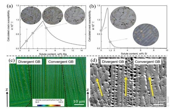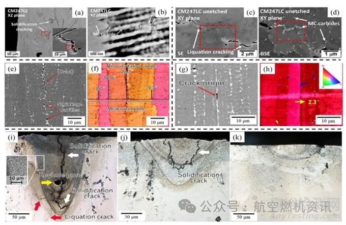 最后但并非最不重要的是,表面裂紋也是一種需要關(guān)注的關(guān)鍵缺陷。Tang等在SLM制造CM247LC時(shí)采用邊界掃描策略,旨在提高表面光潔度。雖然使用邊界掃描策略獲得了光滑的表面但結(jié)果表明,與體塊區(qū)域相比,邊界區(qū)域存在更多的裂紋,如上圖g所示。隨后,檢查了邊界區(qū)和體區(qū)晶體結(jié)構(gòu),分別以粗柱狀晶粒和細(xì)長織構(gòu)晶粒為特征,如上圖h所示。表面裂紋沿邊界區(qū)域的高角度晶界出現(xiàn)。邊界區(qū)較大的柱狀晶粒與高密度的幾何必要位錯(cuò)(GND)有關(guān),這意味著更高的內(nèi)應(yīng)力,從而具有更高的裂紋敏感性。因此,在表面光潔度和表面附近區(qū)域的裂紋之間的權(quán)衡是裂紋敏感合金(如鎳基高溫合金)的AM的關(guān)鍵問題。需要同時(shí)考慮這些因素對工藝參數(shù)進(jìn)行仔細(xì)優(yōu)化。