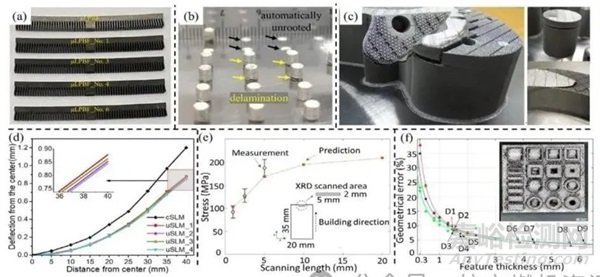 (a-c) 典型的幾何相關(guān)缺陷,包括變形和分層;(d) 微型LPBF和常規(guī)LPBF制作懸臂梁的畸變情況;(e) 殘余應(yīng)力與掃描長度的函數(shù)關(guān)系;(f) 打印零件幾何誤差與特征厚度的函數(shù)關(guān)系