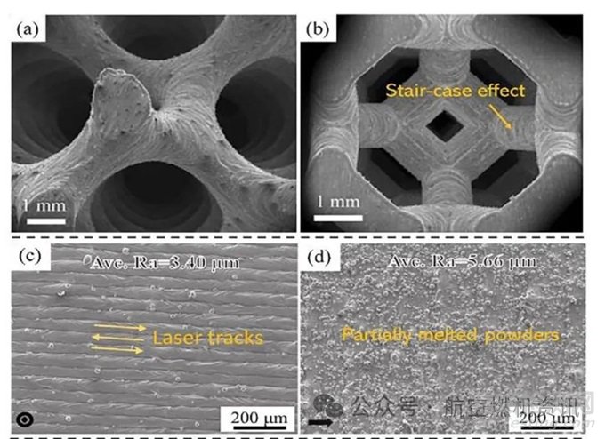 表面完整性缺陷是指與CAD設(shè)計(jì)模型的理想輪廓相偏離的不均勻或不規(guī)則的表面特征??偨Y(jié)了造成AM部件表面完整性相關(guān)缺陷的四個(gè)主要因素,即階梯效應(yīng)、部分熔化的粉末、球化效應(yīng)和表面裂紋。與機(jī)械加工等傳統(tǒng)制造工藝相比,這些缺陷導(dǎo)致表面粗糙度較高,質(zhì)量和精度較低,這是AM工藝固有的局限性之一。