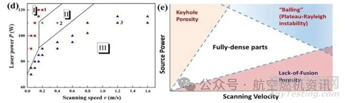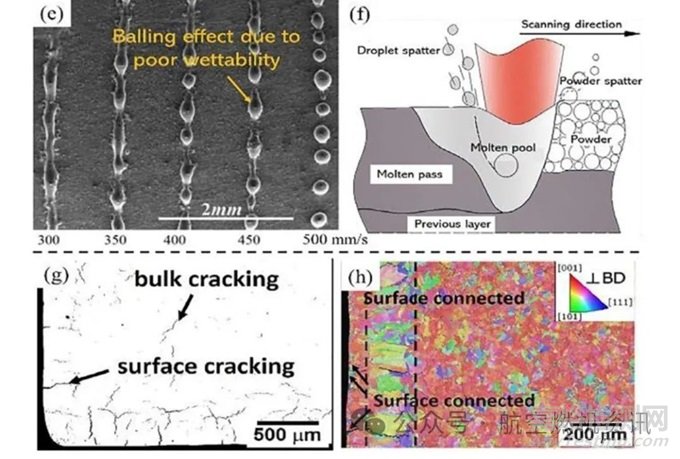 在AM過程中,球化效應(yīng)是一個(gè)相當(dāng)普遍的問題,甚至被認(rèn)為是金屬AM中表面缺陷和氣孔的主要原因之一,尤其是鋁合金等輕質(zhì)合金。它發(fā)生在AM過程中,因?yàn)橐簯B(tài)金屬的表面張力通過產(chǎn)生液體球體使表面積最小化。球化效應(yīng)是一種復(fù)雜的冶金行為,它是由潤濕性差和液滴飛濺引起的。如果能量輸入不足,則熔池下部太淺,無法充分滲透到下部層,它不能克服上部的表面張力。這種較差的潤濕性,直接導(dǎo)致液球的形成。液球的形成,例如下圖e中,隨著激光掃描速度的增加(能量輸入的減少),熔池被拉長,伴隨著潤濕性的降低,它往往會(huì)破裂成不連續(xù)的小球。在一定程度上增加能量輸入,可以改善潤濕性,抑制球化效應(yīng)。然而,過多的能量輸入可能會(huì)因液滴飛濺而再次誘發(fā)成球效應(yīng),如下圖f所示。如此高的能量密度會(huì)產(chǎn)生不穩(wěn)定的熔池,伴隨著金屬的蒸發(fā)和較大的反沖壓力,致使熔化的金屬和未熔化的粉末飛濺。濺落的液態(tài)金屬形成微尺度的凝固球體落在表面上。由于液體的低粘度和長壽命,這種液滴飛濺誘導(dǎo)的球化效應(yīng)在高激光功率和低掃描速度的條件下普遍存在。而且,球化效應(yīng)不僅會(huì)導(dǎo)致表面粗糙度增加,還會(huì)導(dǎo)致金屬粉末沉積不均勻,并可能誘發(fā)孔隙和分層。
