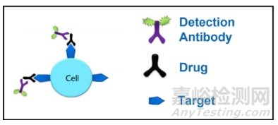 間接法:使用和藥物非競(jìng)爭(zhēng)性的抗體測(cè)出靶點(diǎn)的總量(圖2-C),使用和藥物競(jìng)爭(zhēng)的抗體測(cè)出游離位點(diǎn)(圖2-A)也就是沒有被藥物占據(jù)的靶點(diǎn)的量,兩者相減后,除以靶點(diǎn)總量即可得出受體占有率?;竟饺缦拢菏荏w占有率%=100%-游離受體/總受體×100%。間接法的檢測(cè)試劑的選擇同樣重要,其中篩選到合適的競(jìng)爭(zhēng)性抗體是關(guān)鍵。此外也可以采用熒光標(biāo)記藥物進(jìn)行間接法受體占有率測(cè)定。
