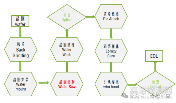 晶圓加工后有磨片、晶圓安裝、切割、銀漿固化、引線焊接等環(huán)節(jié)都可能造成芯片裂,從工序看,到最后封裝還有兩道工序檢測,以及到最后還有測試,怎么沒有把問題檢測出來呢?在案例中,主要關注“晶圓切割”(Wafer Saw)工藝帶來的問題以及遺留到后端的分析。