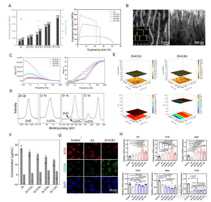 具有骨免疫調(diào)節(jié)能力的生物可降解鋅支架的優(yōu)越力學(xué)性能和適當(dāng)表面腐蝕及離子釋放行為是主要考慮因素。對(duì)于Zn-Li合金,強(qiáng)度、塑性和Li元素的加入之間存在權(quán)衡(圖1a)。由Zn和LiZn4組成的層狀微觀結(jié)構(gòu)主要出現(xiàn)在Zn-0.8Li合金中,層間距為200–300 nm(圖1B)。當(dāng)材料浸入模擬體液(SBF)中時(shí),材料的表面阻抗隨著Li含量的增加而顯著增加(圖1C)。在SBF中浸泡24小時(shí)后,氧化鋅(ZnO)和碳酸鋰(Li2CO3)是SBF-氧化鋰合金中的主要腐蝕產(chǎn)物(圖1D)。Zn-0.2Li和Zn- 0.8Li合金的表面電位分布相似,且在SBF中是均勻的(圖1E)。在細(xì)胞培養(yǎng)基中,Li部分替代鋅的釋放(圖1F),在Zn-0.8Li合金中,Zn:Li比約為4:1。與對(duì)照組和純鋅組相比,Zn-Li合金組的CD206表達(dá)更多,iNOS表達(dá)更少(圖1G),特別是在Zn-0.8Li組中。免疫調(diào)節(jié)細(xì)胞因子IL-4、IL-10、Arg1的RNA表達(dá)在Zn-0.8Li合金組達(dá)到峰值,同時(shí)抑制促炎細(xì)胞因子TNF-ɑ、iNOS、IL-1β等促炎細(xì)胞因子的RNA表達(dá)(圖1H)。