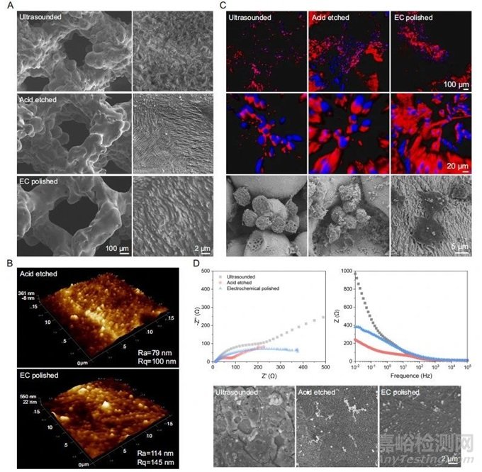 超聲處理后,支架仍覆蓋未熔化的粉末和致密的氧化層(圖2A)。AFM圖像顯示酸蝕刻表面有序的突起,Ra約為79nm(圖2B)。將RAW264.7細(xì)胞接種在支架上,觀察細(xì)胞與表面模式之間的相互作用(圖2C)。Nyquist和bode圖顯示,與打印表面相比,酸蝕刻以較小的阻抗激活支架表面,而EC拋光在一定程度上使表面重新鈍化(圖2D)。