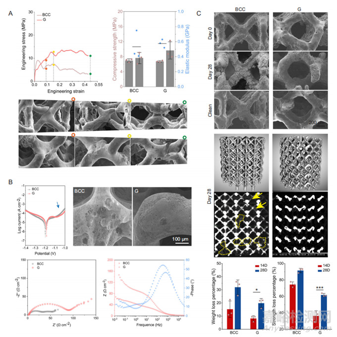圖3 具有體心立方(BCC)和G孔單元的Zn-Li多孔支架的機(jī)械性能和腐蝕性能