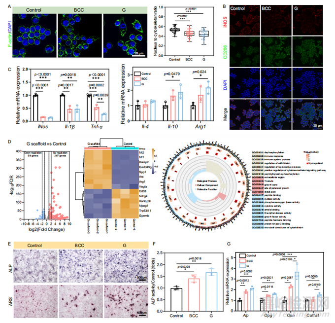 與用 BCC 支架處理的巨噬細(xì)胞相比,G支架處理的巨噬細(xì)胞的細(xì)胞核與細(xì)胞骨架面積比較低(圖5A),表明G支架最大限度地拉伸細(xì)胞骨架。BCC和G支架組均顯著上調(diào) CD206 表達(dá),同時(shí)抑制 iNOS 表達(dá)(圖5B)。與對(duì)照組相比,BCC支架組和G支架組中與M1表型相關(guān)的基因表達(dá)下調(diào),而與M2表型相關(guān)的基因表達(dá)均上調(diào)(圖5C)。為了探討G支架誘導(dǎo)巨噬細(xì)胞極化的生物分子機(jī)制,采用轉(zhuǎn)錄組分析分析Zn組和對(duì)照組巨噬細(xì)胞的信號(hào)通路差異(圖5D)。火山圖顯示有287個(gè)上調(diào)基因和58個(gè)下調(diào)基因,表明存在廣泛的基因表達(dá)差異。為了研究巨噬細(xì)胞極化對(duì)成骨分化的影響,將MC3T3-E1細(xì)胞在含有成骨成分的條件培養(yǎng)基(CM)中培養(yǎng)。第14天對(duì)礦化基質(zhì)中鈣結(jié)合蛋白的ARS染色顯示,G支架組的鈣結(jié)節(jié)的大小和數(shù)量都高于BCC組,表明MC3T3-E1細(xì)胞的鈣沉積效率更高(圖5E、F)。采用qRT-PCR方法檢測(cè)Alp、Opg、Opn和Col1a1的mRNA相對(duì)表達(dá)水平,與對(duì)照組相比,BCC組和G組的成骨相關(guān)基因表達(dá)均增加(圖5G)。