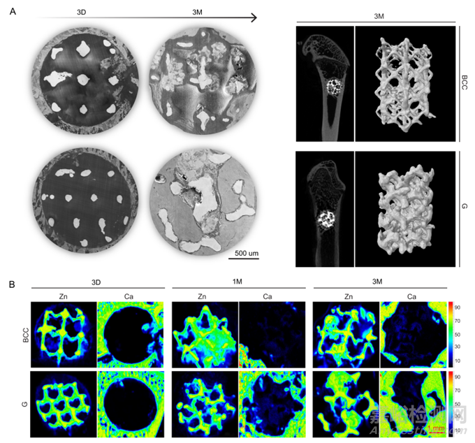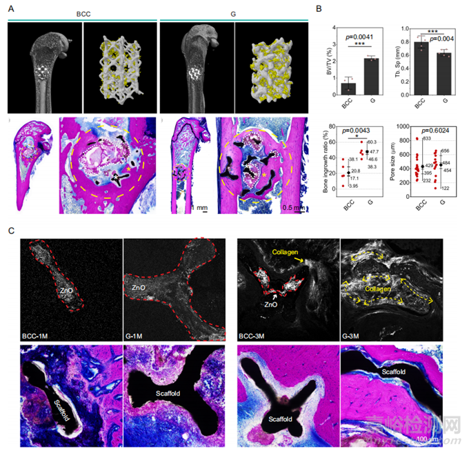 采用X射線熒光成像光譜儀(XRF)、掃描電子顯微鏡(SEM)和顯微CT等方法,對(duì)Zn-Li多孔支架隨時(shí)間推移的2D和3D生物降解情況進(jìn)行可視化。第3天,在骨缺損區(qū)清晰可見輪廓完整的支架支柱(圖6A)。XRF檢測(cè)到分布在孔隙區(qū)域和缺損區(qū)域邊緣的Zn(藍(lán)色)信號(hào)(圖6B),表明支架的早期生物降解。在1個(gè)月時(shí),BCC支架發(fā)生嚴(yán)重降解,部分孔隙完全充滿降解產(chǎn)物;相比之下,G支架的降解更加均勻。因此,與BBC相比,具有G的Zn-Li支架在材料的生物降解和骨再生之間具有更好的匹配性。