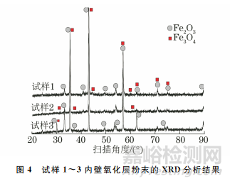 圖4為試樣1~3內(nèi)壁氧化層粉末的 XRD分析結(jié)果。由圖4可知:試樣1~3內(nèi)壁氧化物的物相組成為Fe2O3和Fe3O4,這與化學(xué)成分分析結(jié)果吻合;隨著服役時(shí)間的延長(zhǎng),F(xiàn)e2O3含量增大,試樣2內(nèi)壁氧化物主要為Fe2O3。