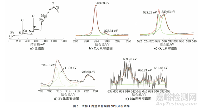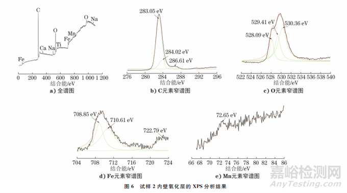 圖5為試樣1內(nèi)壁氧化層的XPS分析結(jié)果。由圖5可知:試樣1內(nèi)壁存在 C、O、Mn、Fe、Ti、Na、Ca、S、Cl等元素,窄譜圖中可見(jiàn)C、O、Fe、Mn元素的化學(xué)態(tài),288.17,285.80,284.60eV峰分別對(duì)應(yīng)C=O、C—O、C—H/C=H 鍵;722.82,710.10eV峰對(duì)應(yīng)Fe原子的雜化軌道,結(jié)合O元素窄譜圖中的529.90eV 峰,判定內(nèi)壁氧化層物相為Fe2O3和Fe3O4;644.26,644.26eV峰對(duì)應(yīng)Mn元素的雜化軌道,結(jié)合O元素窄譜圖中的528.19eV峰,判定試樣內(nèi)壁氧化層生成了Mn2O3 。綜上所述,試樣1氧化層內(nèi)壁表面Fe元素和Mn元素發(fā)生了氧化反應(yīng),生成了Fe2O3、Fe3O4和Mn2O3。
