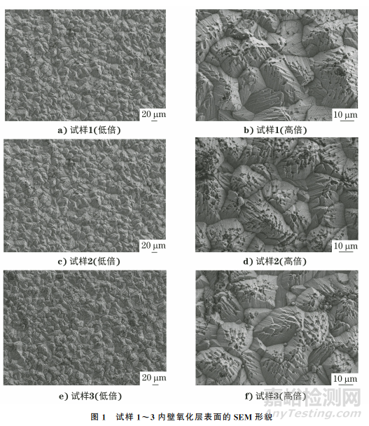 圖1為試樣1~3內(nèi)壁氧化層表面的SEM形貌。由圖1可知:試樣1~3的內(nèi)壁表面形貌相似,均呈高低起伏的丘壑狀,因?yàn)檠趸锏纳伤俾什灰恢?;氧化層均存在孔洞,氧化顆粒尺寸較大,直徑為10~20μm。