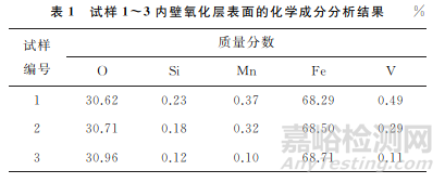 表1為試樣1~3內(nèi)壁氧化層表面的化學(xué)成分分析結(jié)果。由表1可知:試樣1~3的氧化物主要含有Fe、O等元素,說(shuō)明氧化物主要由鐵的氧化物組成;隨著服役時(shí)間的延長(zhǎng),氧化程度顯著提高。