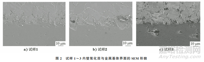 圖2為試樣1~3內(nèi)壁氧化層與金屬基體界面的SEM形貌。由圖2可知:試樣1基材晶界處粒狀碳化物較少,且碳化物顆粒細(xì)小,呈彌散分布,氧化層組織致密,與基體之間未出現(xiàn)明顯的分層;隨著服役時(shí)間的延長(zhǎng),試樣3的組織晶界粗化,碳化物增多且明顯聚集,逐步呈現(xiàn)連續(xù)分布的趨勢(shì),氧化層組織疏松,且與金屬基體有明顯的分界面。