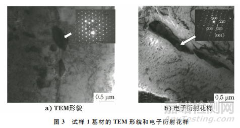 圖3為試樣1基材的TEM形貌和電子衍射花樣。由圖3可知:試樣1晶界碳化物彌散分布,為面心立方結(jié)構(gòu)的Cr23C6;隨著服役時(shí)間的延長(zhǎng),Cr23C6顆粒逐漸長(zhǎng)大。