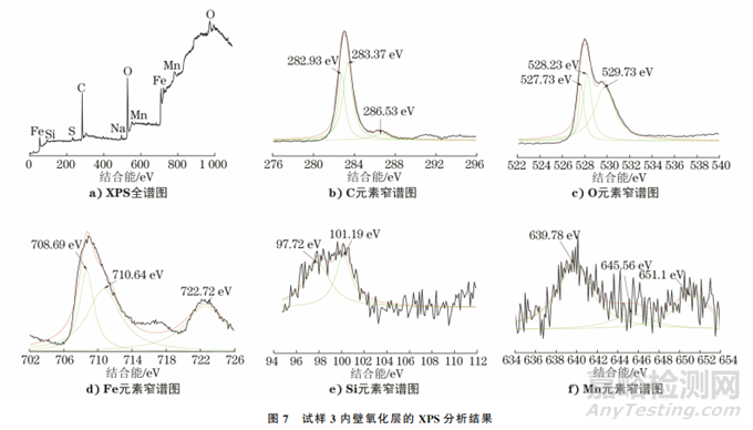 圖7為試樣3內(nèi)壁氧化層的XPS分析結(jié)果。由圖7可知:試樣內(nèi)壁表面存在C、O、Mn、Fe、Si等元素,286.37,283.37,282.93eV峰對(duì)應(yīng)C=O、C—O、C—H/C=H鍵;Fe元素窄譜圖中722.82,710.04,708.29eV峰對(duì)應(yīng)Fe原子的雜化軌道峰,結(jié)合O元素窄譜圖中的529.53、528.32、527.73eV峰,判定試樣表面生成了Fe2O3、FeO和Fe3O4;Si元素窄譜中的100.19,97.72eV峰對(duì)應(yīng) Si4+離子,結(jié)合O元素窄譜中的528.32eV 峰,判定試樣內(nèi)壁表面生成了SiO2;Mn元素窄譜圖中650.91,639.37eV峰對(duì)應(yīng) Mn原子的雜化軌道峰,結(jié)合O元素窄譜中的528.32eV峰,判定試樣內(nèi)壁表面生成了 MnO2。綜上所述,試樣3內(nèi)壁表面生成了 Fe2O3、FeO、Fe3O4、SiO2、MnO2等物質(zhì)。對(duì)比試樣1,2,試樣3的金屬元素與蒸汽中的O元素結(jié)合,形成的氧化物種類(lèi)較多,說(shuō)明隨著服役時(shí)間的延長(zhǎng),金屬整體氧化程度顯著提高。