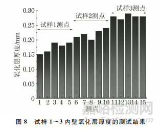 圖8為試樣1~3內(nèi)壁氧化層厚度的測(cè)試結(jié)果,在每個(gè)試樣上抽取5個(gè)測(cè)試點(diǎn)。由圖8可知:試樣1~3內(nèi)壁氧化層厚度為0.15~0.3 mm,隨著服役時(shí)間的延長(zhǎng),試樣3內(nèi)壁氧化層的厚度增大。