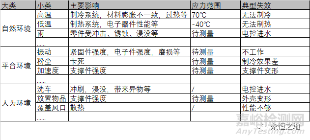 以剛才我們講的大貨車上裝空調(diào)為例。我們給它列舉應(yīng)力,大概可以做一個這樣的環(huán)境應(yīng)力表。我這里只是隨便示意一下,意思是可以用這種方式來幫助自己去識別。