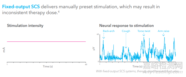 傳統(tǒng)的固定輸出 SCS 設(shè)備可提供持續(xù)、溫和的電脈沖,在疼痛信號(hào)到達(dá)大腦之前就將其破壞。