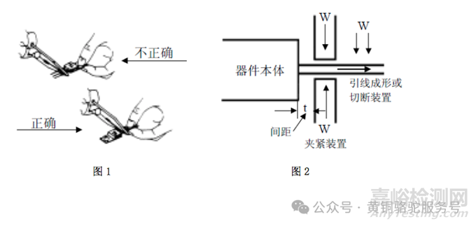 a) 打彎引線時必須在管體和打彎點之間用鉗子夾緊以防止將應力直接加在管體引線間如圖1 所示,切斷引線時亦應如此如圖2 所示。