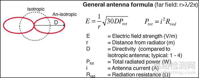 功率吸收鉗、電磁鉗、電流探頭用于輻射問題的診斷分析都取得很好的效果,是因為三者都是通過線纜共模電流來評估遠(yuǎn)場發(fā)射。實際產(chǎn)品大部分輻射發(fā)射都是通過線纜形成的天線進(jìn)行傳輸?shù)?,因此線纜輻射發(fā)射的物理現(xiàn)象遵循經(jīng)典的天線電磁輻射發(fā)射模型和物理公式。經(jīng)典電磁理論中射頻電流與遠(yuǎn)場電場的相互關(guān)系如下: