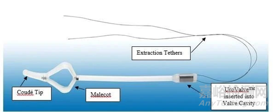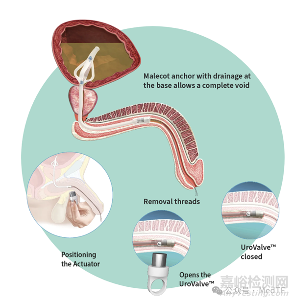 CymActive I.U.C為硅膠制備,需要插入尿道至膀胱,允許植入人體30天。遠(yuǎn)端設(shè)置有一個(gè)電磁閥(UroValve),患者能夠通過CymActive Actuator打開電磁閥,釋放膀胱內(nèi)的尿液。