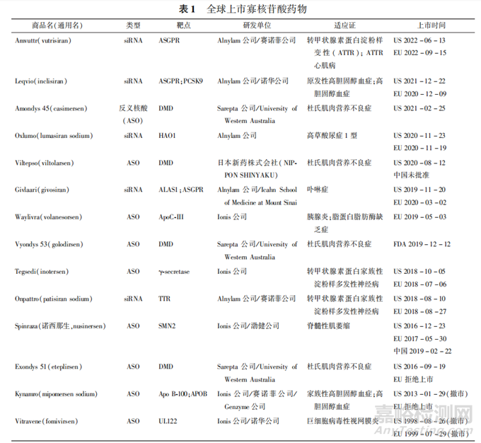 隨著基因診斷技術(shù)和對(duì)疾病分子機(jī)制認(rèn)識(shí)的發(fā)展,RNA療法正逐漸成為一種新的、非常有前途的治療方法,用于個(gè)性化和精準(zhǔn)醫(yī)療,可治療罕見病和常見疾病。全球已上市寡核苷酸藥物見表1,共14個(gè)藥物,其中12個(gè)均在2016年之后上市。