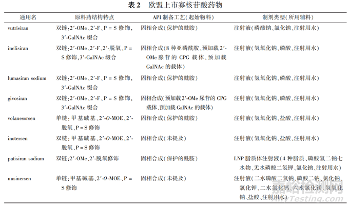 經(jīng)查詢歐洲EMA的官方評(píng)估報(bào)告(EPAR),本文總結(jié)了歐盟上市寡核苷酸藥物API的結(jié)構(gòu)特點(diǎn)、制備方法、制劑類型及處方,見表2。