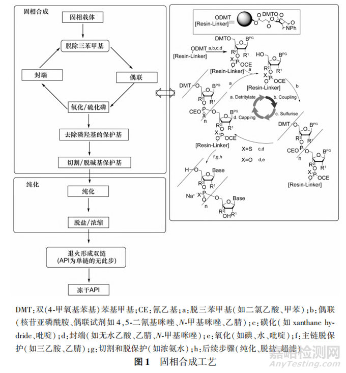 寡核苷酸API采用固相合成工藝(見圖1),在裝有固相載體(成分為化學(xué)修飾的樹脂或玻璃)的填充柱上通過計(jì)算機(jī)編程控制進(jìn)行自動(dòng)化合成,整個(gè)寡核苷酸樹脂的合成是連續(xù)進(jìn)行的。
